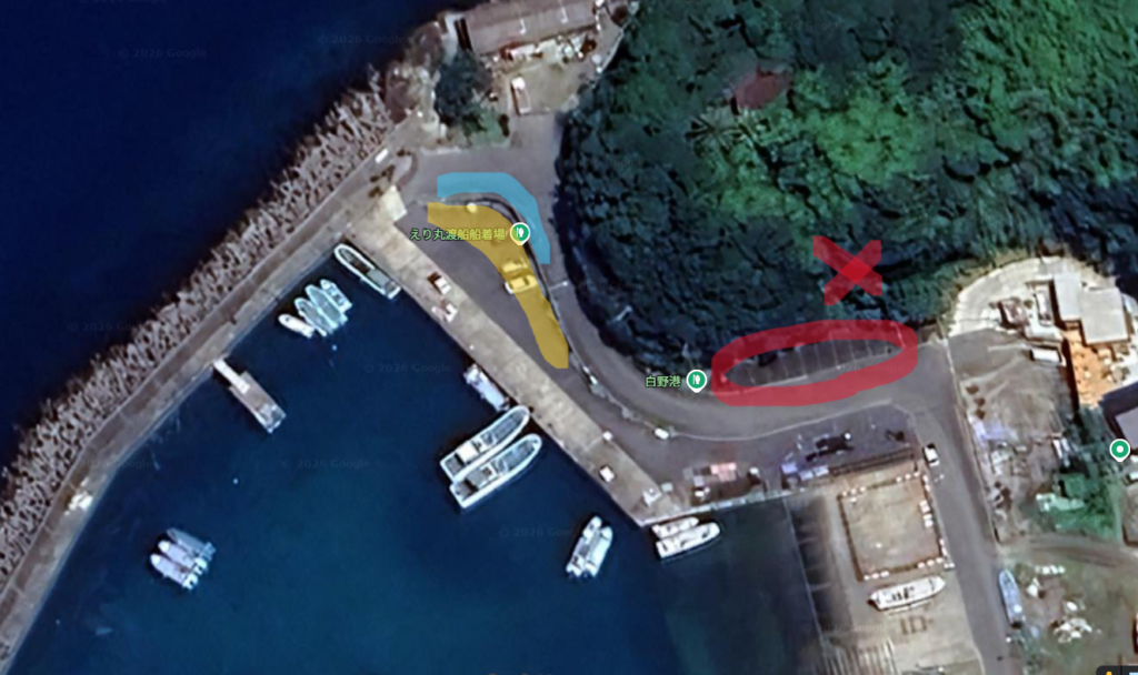 赤い丸の部分はえり丸用ではなく ” しょらさん渡船 ” の駐車場です。決して駐車しないように!