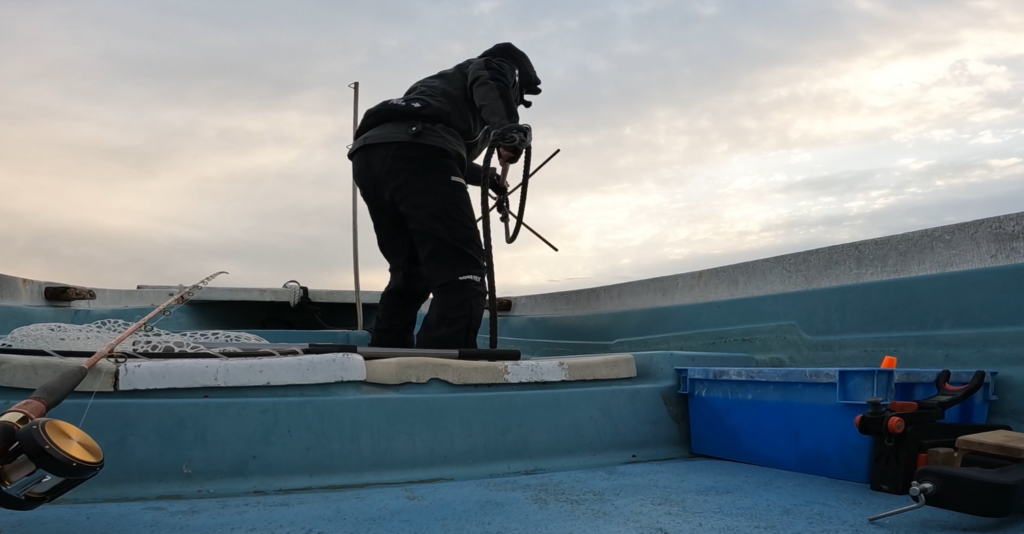 着底したら、8ヒロ分ロープの垂らして 船の先端に括り付けよう。