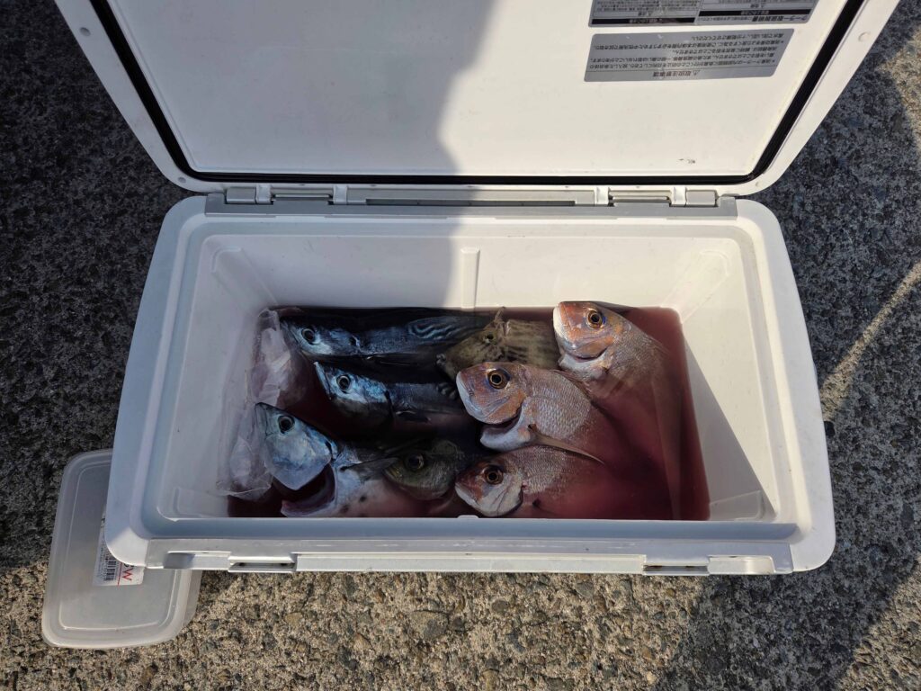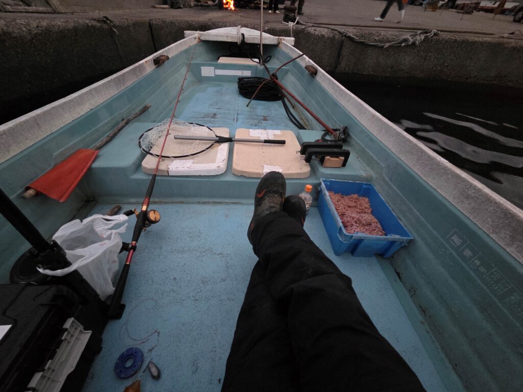 親船は ” 磯渡し ” のお客様を先に沖磯に連れて行ってから ” 伝馬船 ” で沖に向かうため、ちょっと待ち時間がありますが、イライラせずに餌の準備やタックルの準備をじっくりとやっておきましょう。