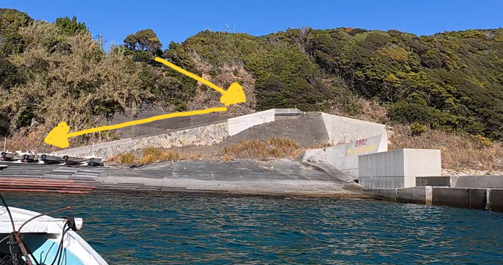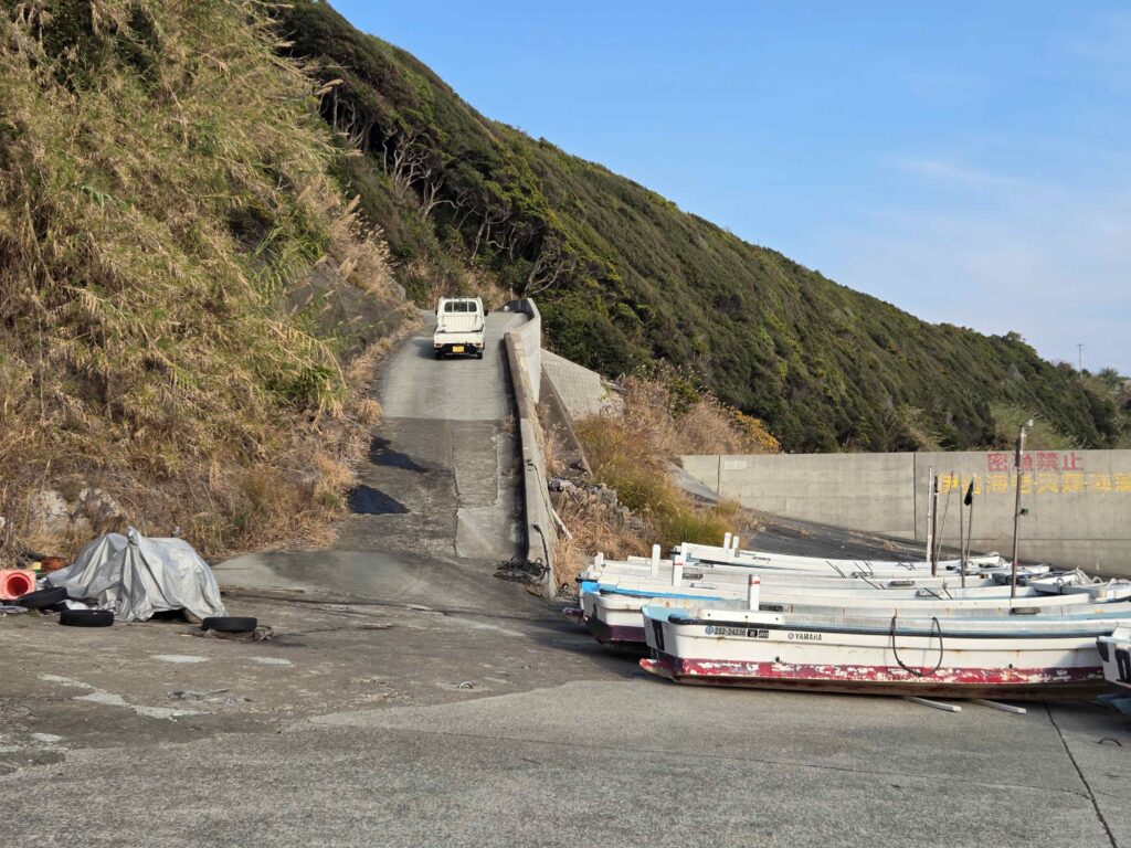 目印の看板から漁港に降りてゆきますが、、、ここがなかなかのビビりポイントです。